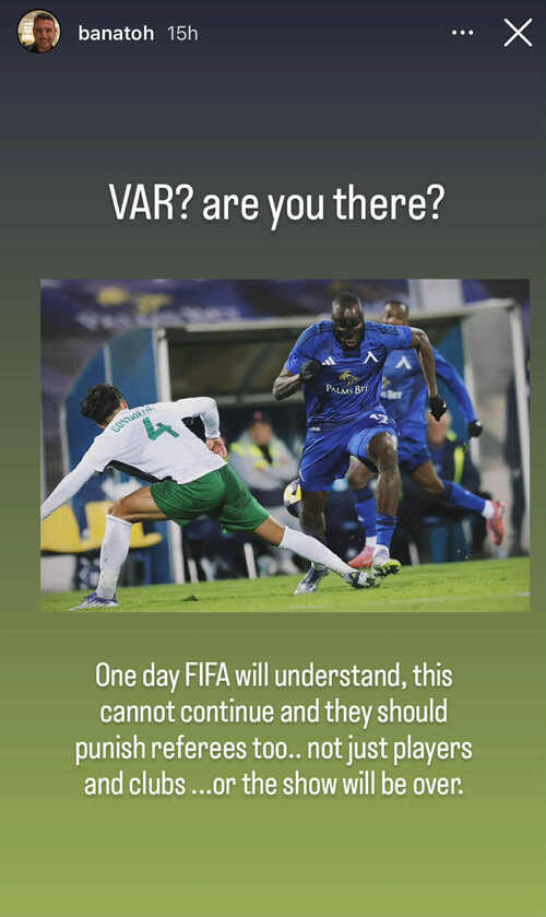 "ВАР, там ли си? Един ден ФИФА ще разбере, това не може да продължава и трябва да наказват и съдии, не само играчи и клубове, или шоуто ще приключи", написа Банато в Instagram.