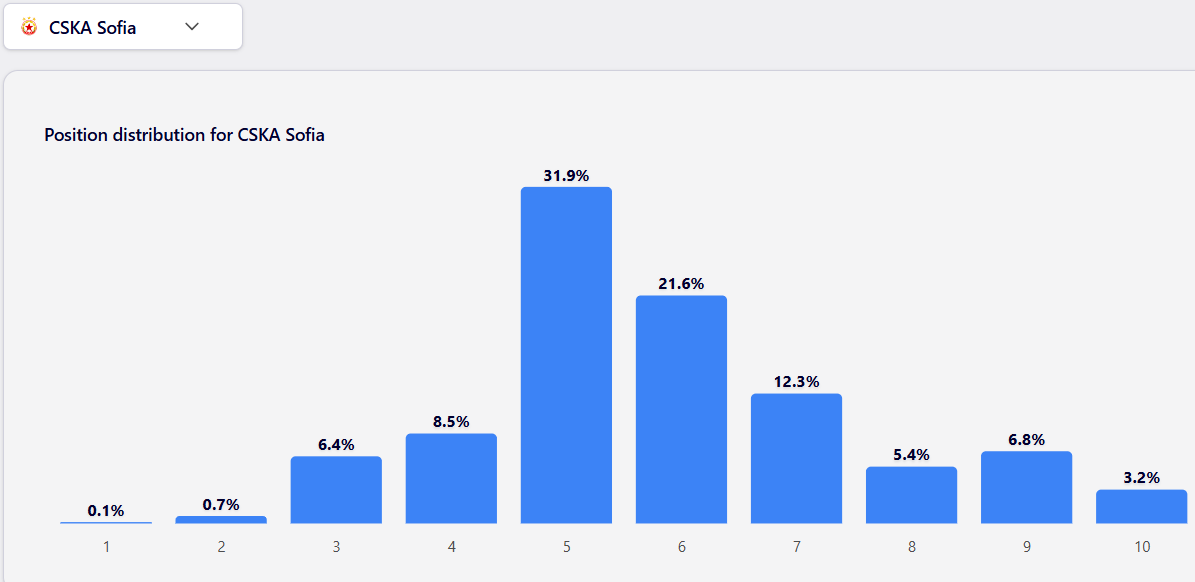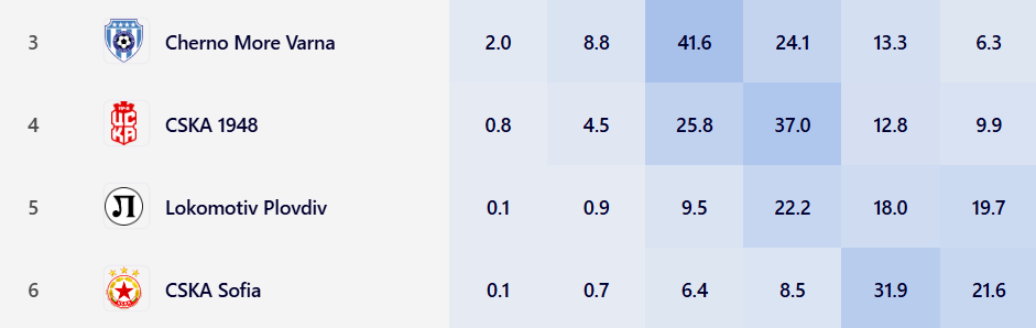Суперкомпютърът на „Football Meets Data“, който вече прави симулации и с българското първенство, изчислява, че към днешна дата (20 октомври 2025 година) ЦСКА трудно ще се пребори за място в топ 4 и вероятно за трети пореден път ще играе бараж, ако не спечели Sesame Купа на България.