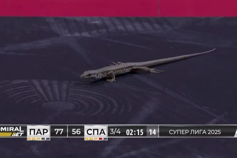 Всичко се случи в третата четвърт, при резултат 77:56, когато телевизионната камера насочи близък план към паркета, на който имаше голям гущер. Всички в залата бяха изненадани и никой не знаеше как влечугото е намерило пътя към игрището.